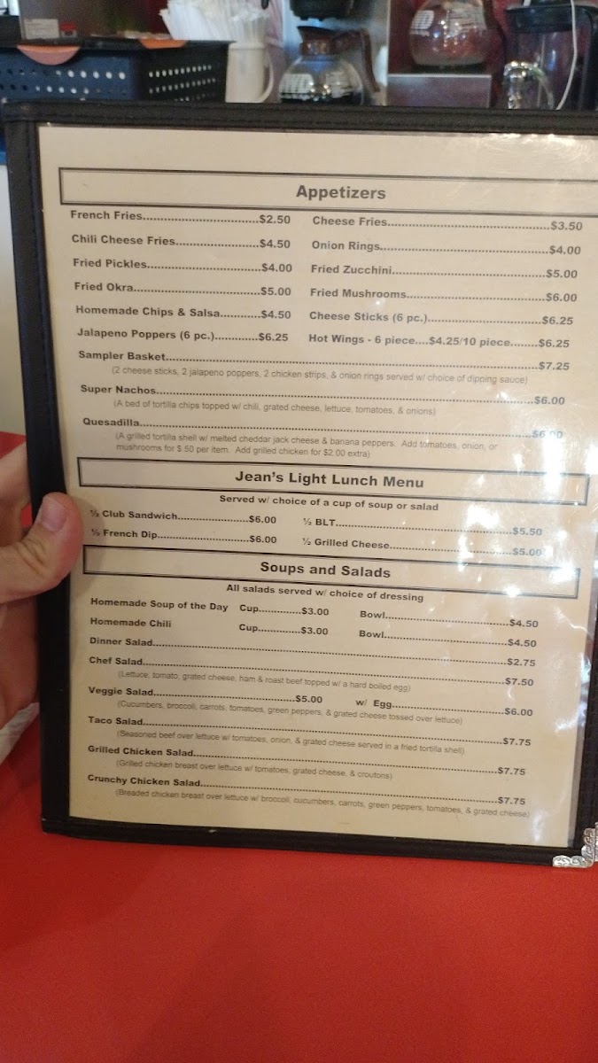Nestled in the heart of Hugo, Colorado, Jean's Family Kitchen serves up a delightful array of comfort food that feels like home. The menu is a treasure trove of flavors, featuring crispy appetizers like fried pickles and super nachos that set the stage for a hearty meal. For those in the mood for something lighter, the soups and salads section offers refreshing options like the grilled chicken salad and taco salad.